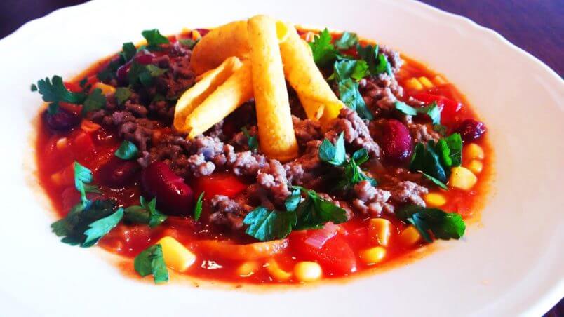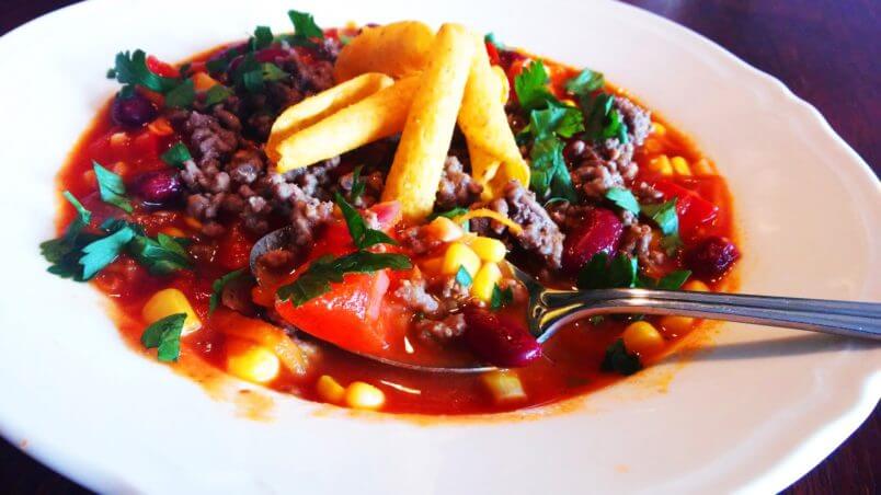 28 maja Pikantna zupa meksykańska z wołowiną, fasolą, kukurydzą i nachosami.