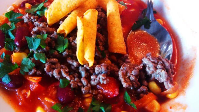 Co jest w środku? Samo dobro : przepyszna mielona wołowina, pożywna fasola, słodka kukurydza, aromatyczna papryka, soczyste pomidory, ossssstre tabasco i chilli, wyrazista cebulka i czosnek i tajemniczy składnik – cynamon. Ostatni dodatek może się Wam wydać dziwny, ale nie hejtujcie tak szybko, tylko zaufajcie. Ta magiczna szczypta dodaje wyrazu i charakteru. A na górze serowe nachosy, bo kto nie lubi nachosów!?