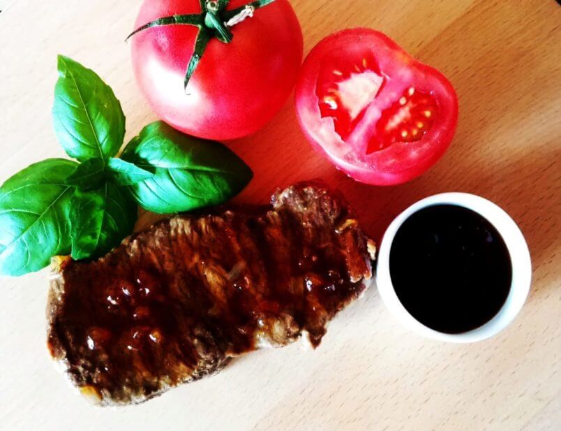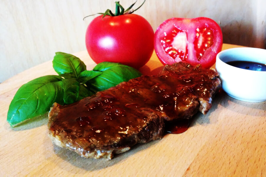 Dowolną ilość mięsa pokroić na plastry o grubości około 3 cm. Doprawić solą i pieprzem i smażyć na odrobinie oliwy po 2 minuty z każdej strony (nie dłużej, bo będzie zbyt suche). Następnie gorące mięso zamoczyć w sosie i smażyć dalej po minucie z każdej strony. Po tym czasie mięso będzie soczyste, a sos będzie miał konsystencję gęstej i aromatycznej glazury.