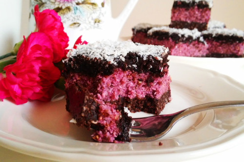 - Wszystkie składniki na górna warstwę dokładnie zblenduj i następnie wylej ją na wierzch zastygniętej malinowej masy. Udekoruj wiórkami kokosowymi i wstaw do lodówki na minimum 4 godziny do schłodzenia (najlepiej na noc). Smacznego!