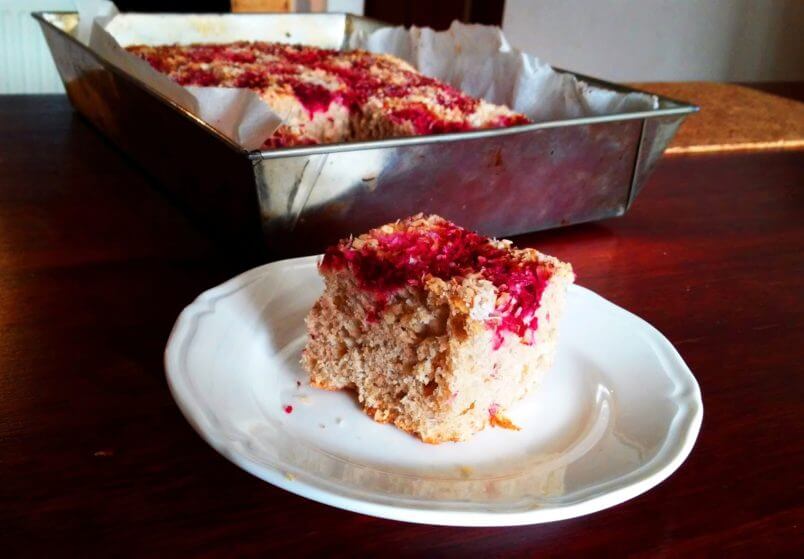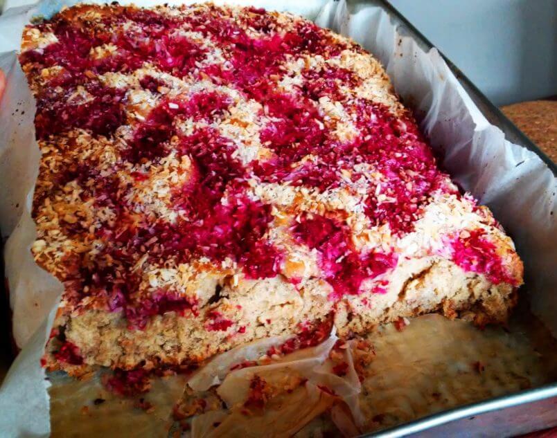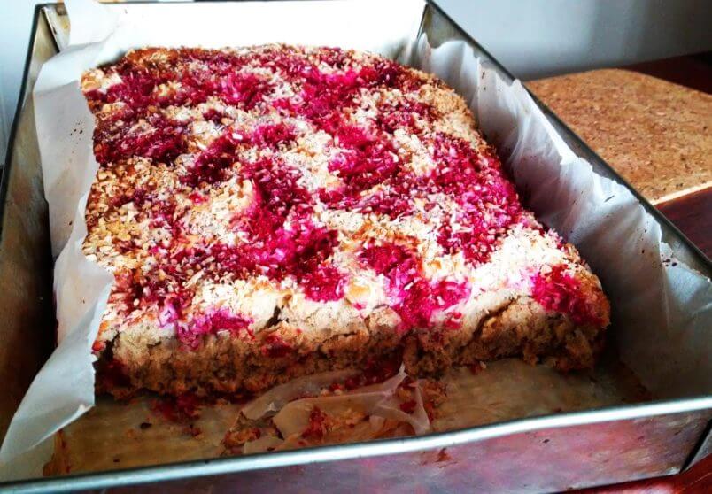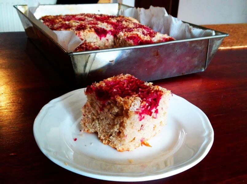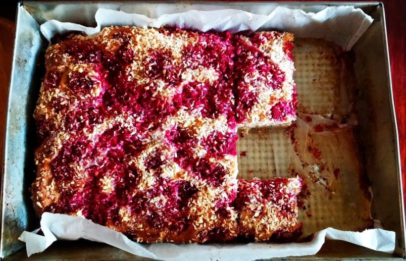 21 Kwi Żytnie ciasto drożdżowe na mleku kokosowym z malinami i wiórkami.