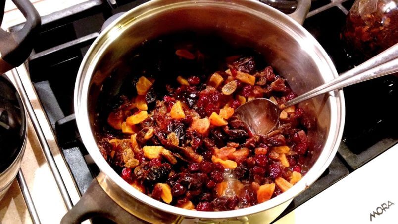 Zaparz herbatę w 400ml wrzątku przez około 10 minut.  Zetrzyj skórkę z 2 cytryn i wrzuć do garnka następnie wyciśnij sok i wlej na dno. Dolej do soku i skórki z cytryny zaparzoną herbatę, dodaj pokrojone suszone śliwki, morele, żurawinę, rodzynki oraz przyprawy (korzenną i cynamon). Gotuj na wolnym ogniu, mieszając co jakiś czas aż płyn prawie w całości zostanie zredukowany, a owoce wciskając herbatę zmiękną. Zdejmij z ognia i pozostaw do ostygnięcia.